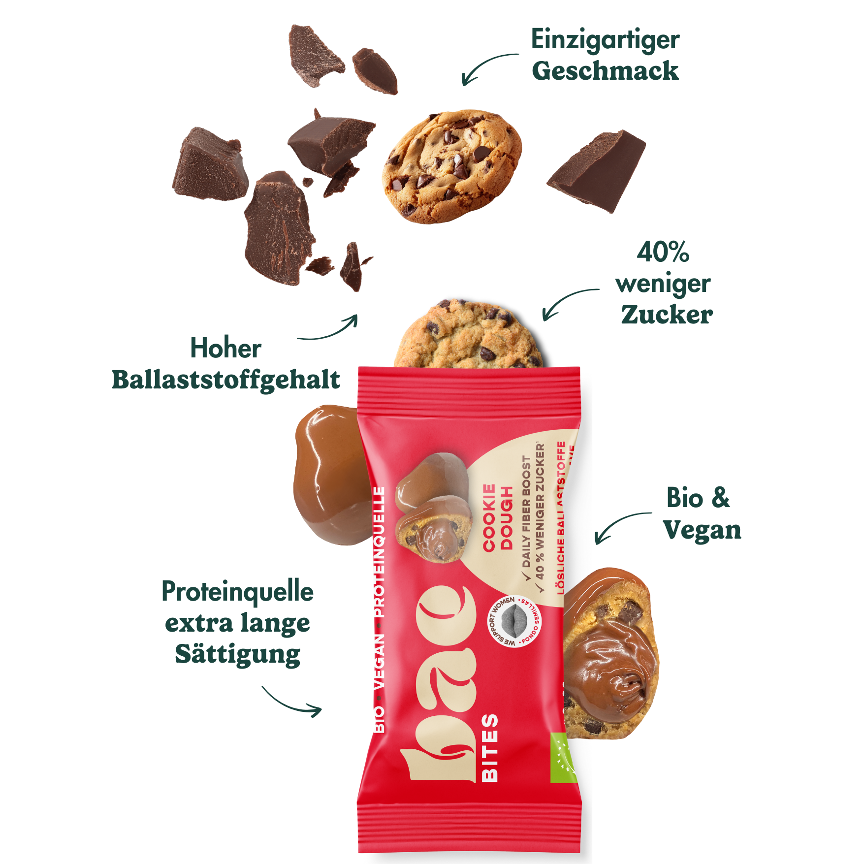 Erlebe den unwiderstehlichen Geschmack von Cookie Dough in Bissenform! Unsere Cookie Dough Bites überzeugen mit einer zarten Nougatfüllung, umhüllt von einer soften Teighülle mit Schoko-Drops und überzogen mit dunkler Schokolade. Sie sind bio, vegan und versorgen dich mit hochwertigen Zutaten und präbiotischen Ballaststoffen – perfekt für eine genussvolle Auszeit!