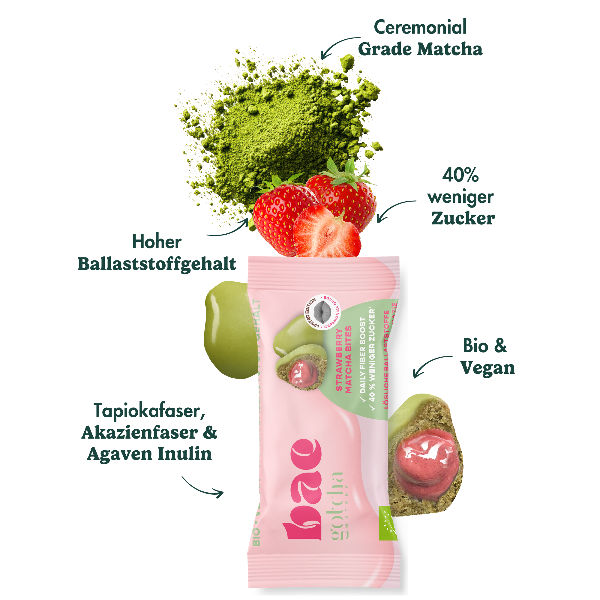 16% Ballaststoffmischung* (Tapiokafaserdextrin*, Agaven-Inulin*, Akazienfaser*), 15% Matcha-Kakao-Überzug* (Rohrzucker*, Kakaobutter*, Mandeln*, Inulin*, Matcha Pulver*, Meersalz, Vanille gemahlen*), Hafermehl*, Cashewmus*, Datteln*, Kokosblütensirup*, Cashews*, Reissiruppulver*, Sheabutter*, Kokosöl*, fermentiertes Erbsenprotein*, 2,0% Matcha Pulver* (ceremonial grade), Sonnenblumenlecithin*, 1,6% Erdbeerpulver*, Meersalz. *Aus ökologischer Landwirtschaft.