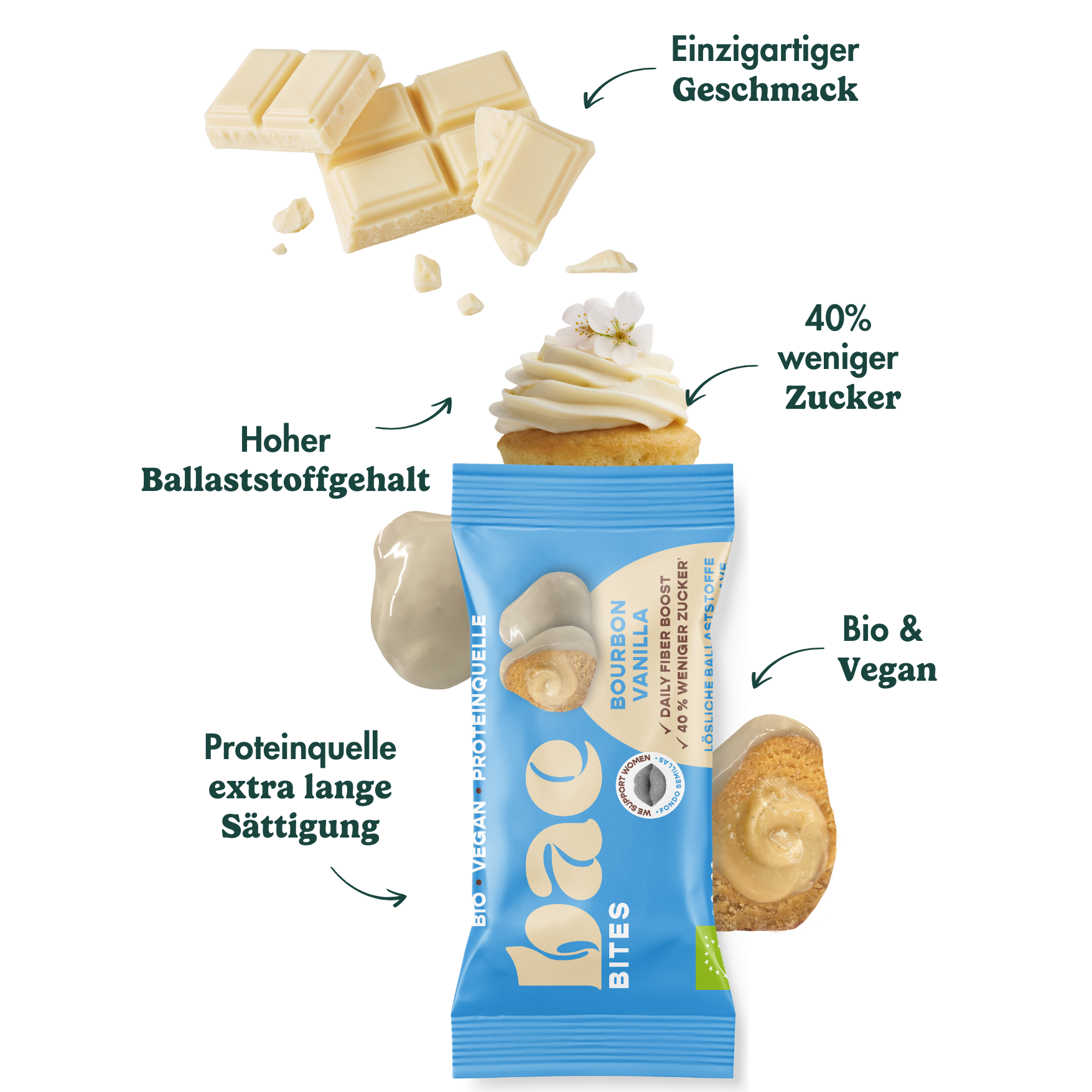 Bio-Bites Bourbon Vanilla: 30%Hafermehl*,Mandelmus*,Mandel-Kakao-Überzug* (Rohrzucker*, Kakaobutter*,Mandeln*, Inulin*, Meersalz, Vanille gemahlen*), Datteln*, Kokosblütensirup*, 4,2% resistentes Tapiokafaserdextrin*, 4,2% Agaven-Inulin*, Feuchthaltemittel: pflanzliches Glycerin aus Leinsamen*, Kakaobutter*, Reissirup*, Traubensaft*, Kokosöl*, 1,0% Vanille gemahlen*, 0,6% Bourbon Vanille*, Himalayasalz, natürliches Aroma. *Aus ökologischer Landwirtschaft.