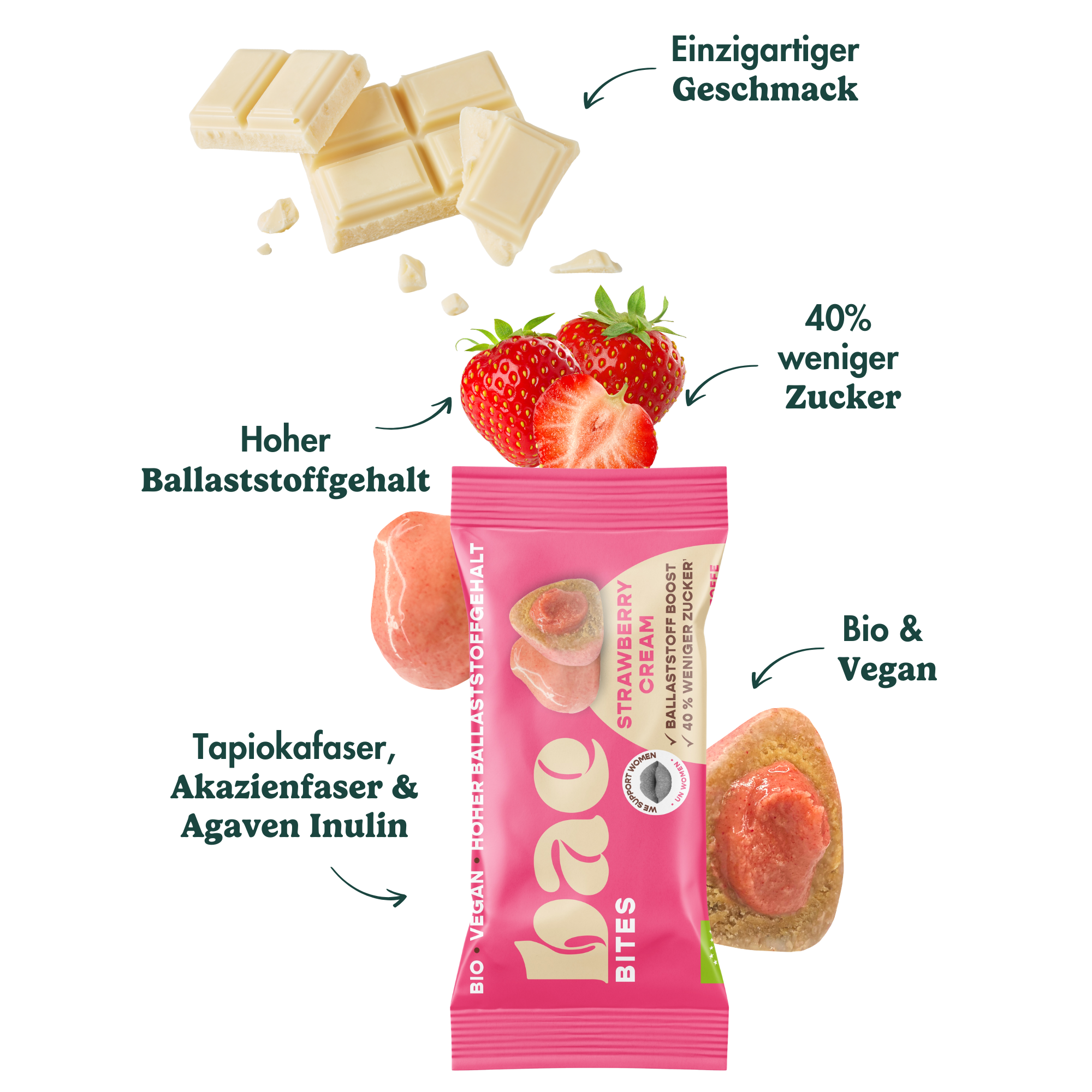 Mit Erdbeercreme gefüllte, softe Bio-Bites – umhüllt von feinster Schweizer Schokolade