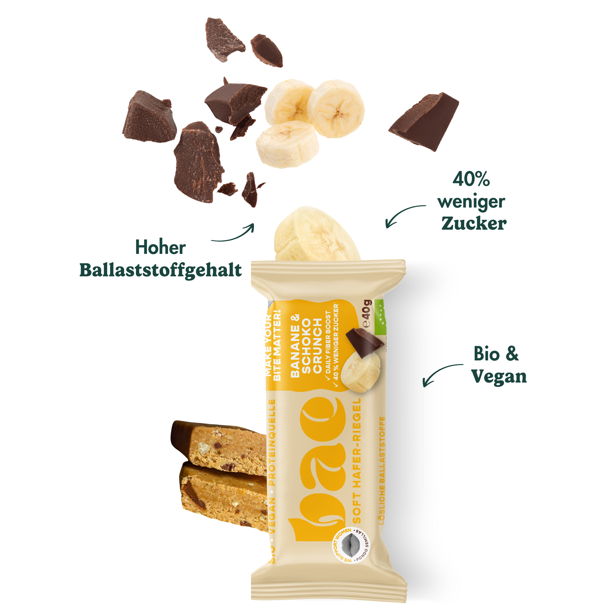 Genieße den unwiderstehlichen Geschmack von Banane und Schokolade – jetzt als Haferriegel! Unser Bio-Haferriegel Banane & Schoko Crunch vereint den köstlichen Geschmack von reifer Banane mit zarten Haferflocken und feiner Schokolade. Er ist bio, vegan und versorgt dich mit wertvollen Zutaten & Ballaststoffen – perfekt für eine genussvolle Auszeit oder als Snack für unterwegs.