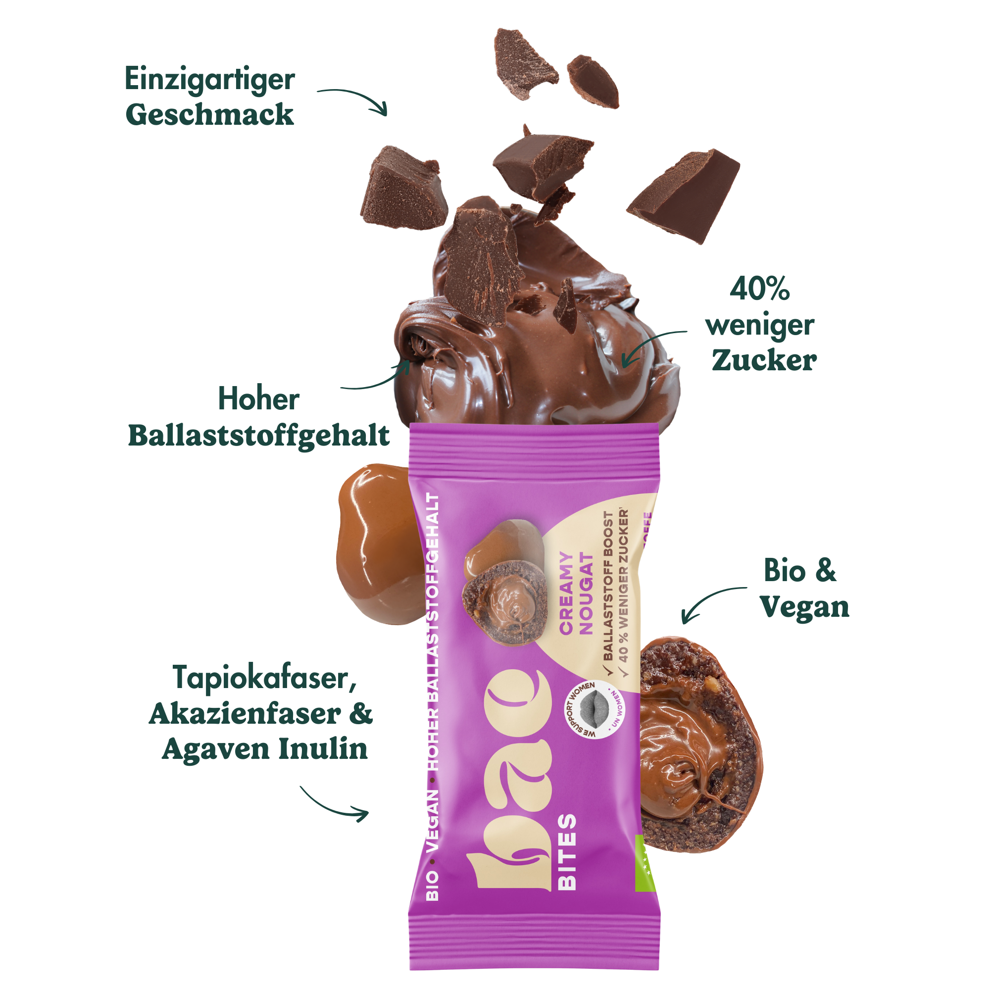 Experience the heavenly taste of nougat in bite-sized pieces! Our Creamy Nougat Bites combine a creamy hazelnut nougat filling with a delicate coating of fine chocolate. They are organic, vegan , and provide you with high-quality ingredients and fiber – perfect for a indulgent break!
