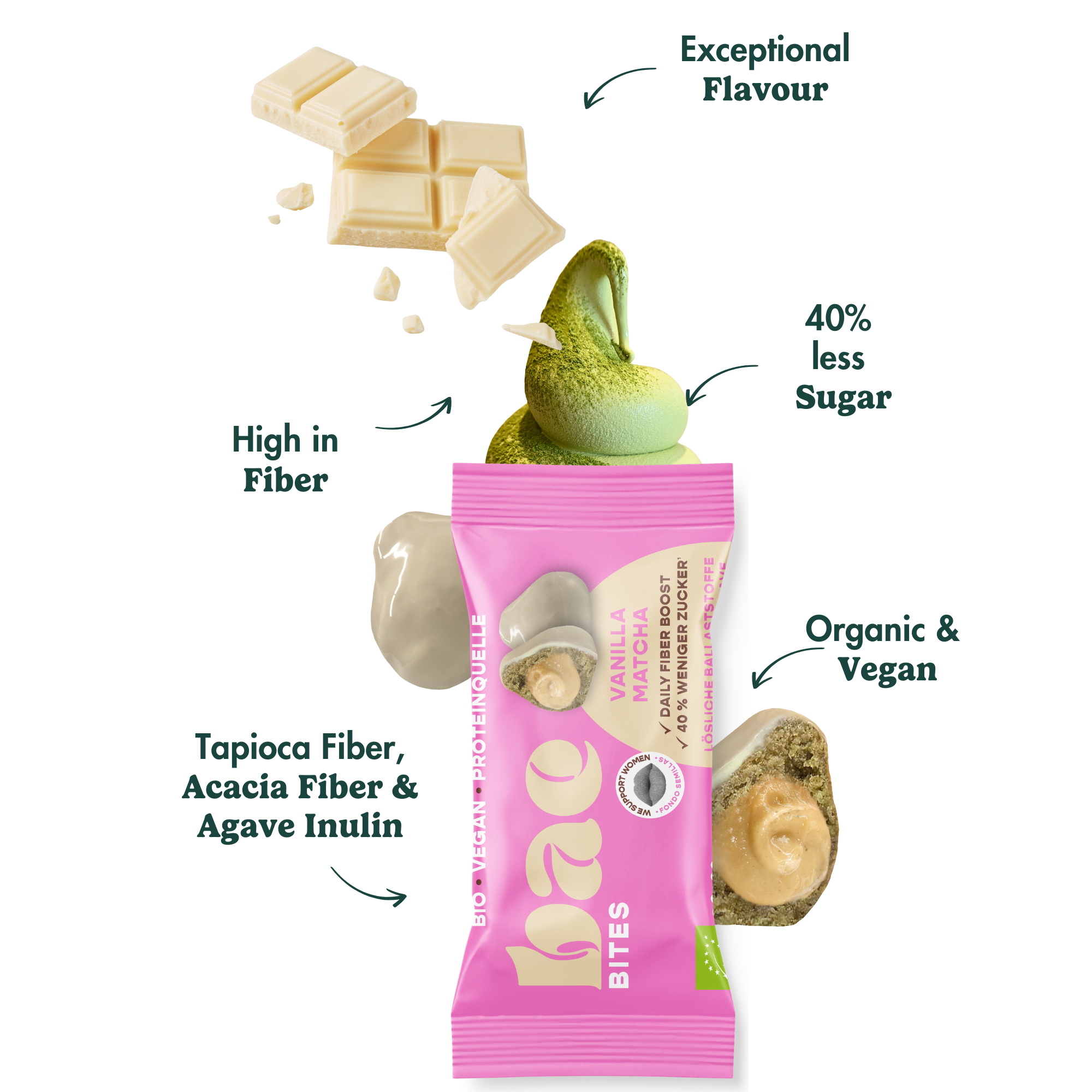 Experience the unmistakable taste of vanilla and delicate matcha in bite-sized pieces! Our Vanilla Matcha Bites feature a creamy vanilla filling , encased in a smooth matcha coating and fine white chocolate . They are organic , vegan , and provide you with high-quality ingredients and fiber – perfect for a indulgent break!