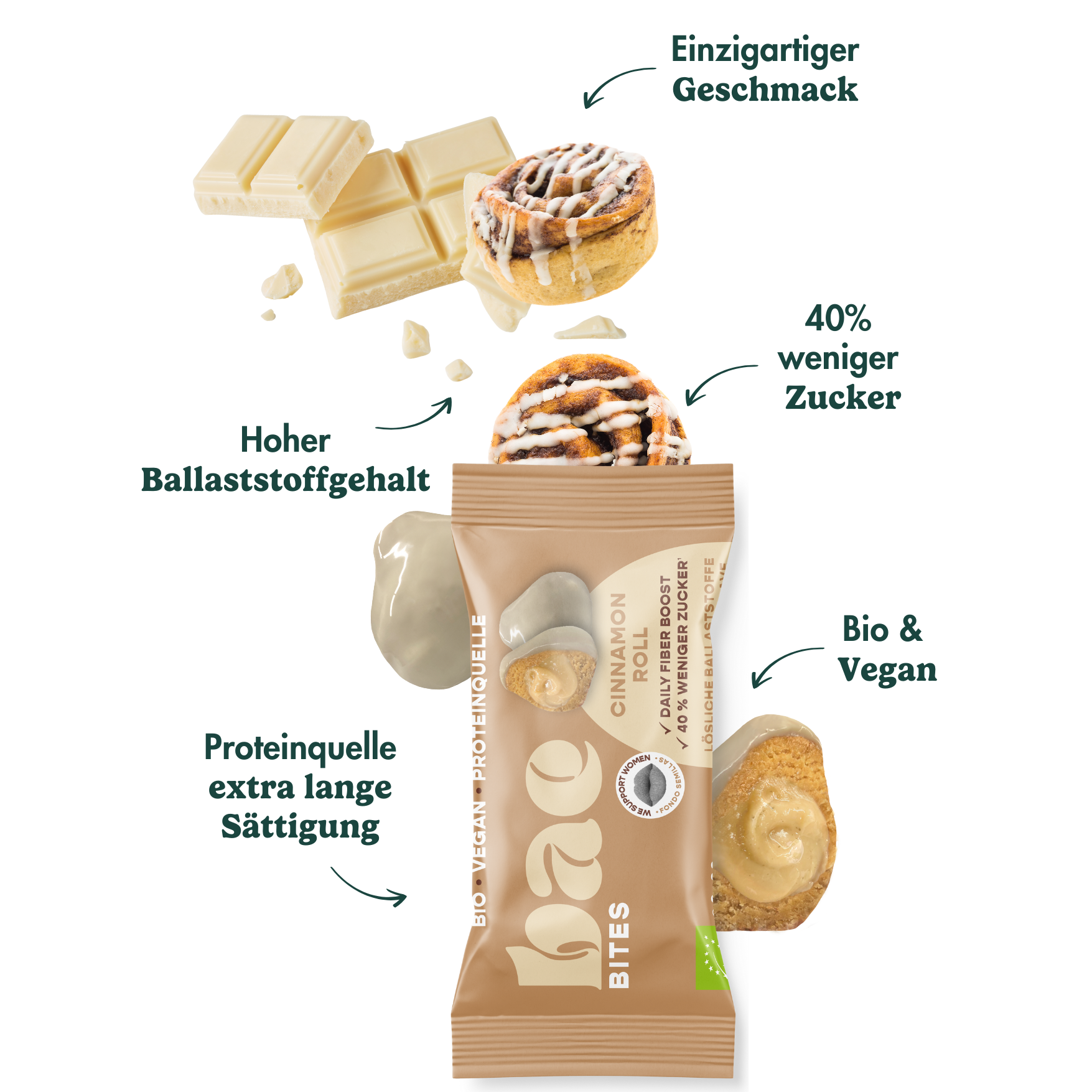 Erlebe den unverwechselbaren Geschmack von zarten Zimtschnecken in Bissenform! Unsere Cinnamon Roll Bites begeistern mit einer aromatischen Zimtfüllung, umhüllt von einer weichen Hülle und feiner Schokolade. Sie sind bio, vegan und versorgen dich mit hochwertigen Zutaten & präbiotischen Ballaststoffen – perfekt für eine genussvolle Auszeit!