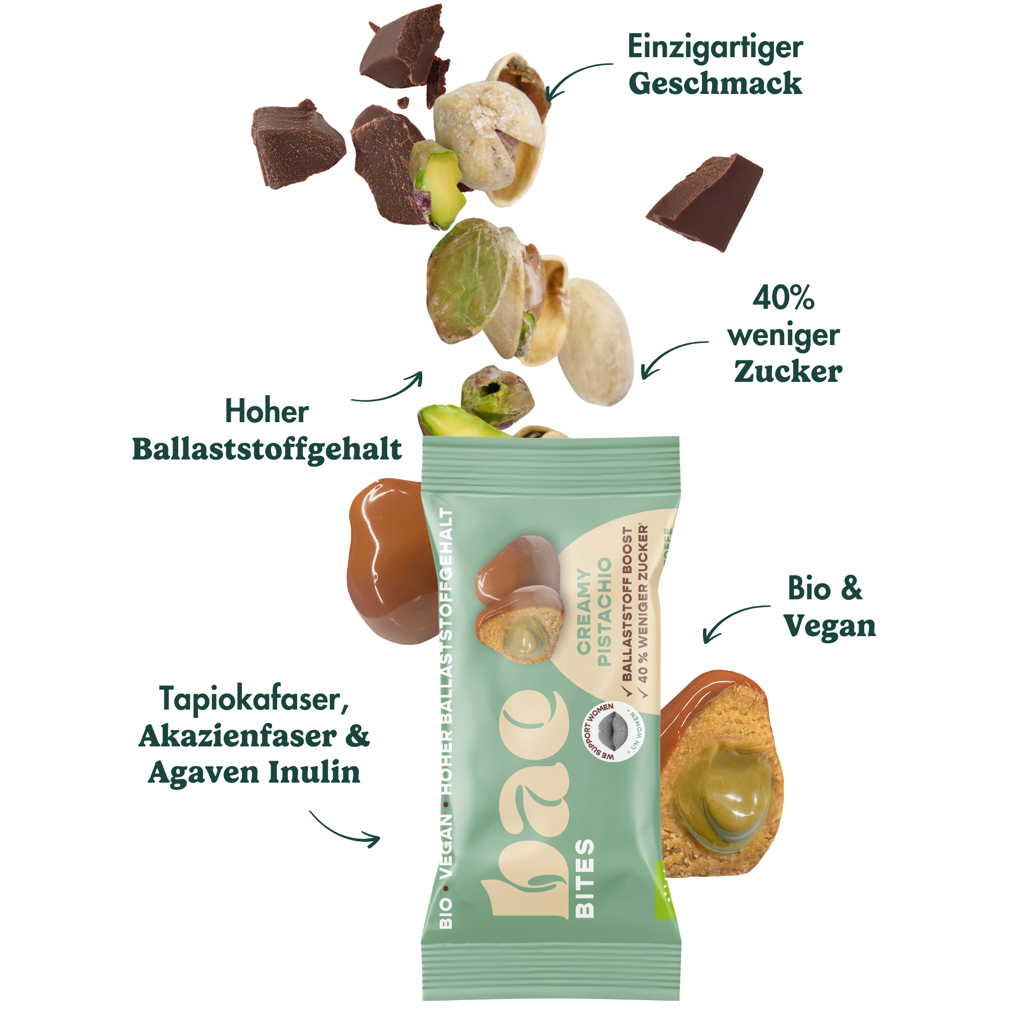 Mit Pistaziencreme gefüllte, softe Bio-Bites – umhüllt von feinster Schweizer Schokolade